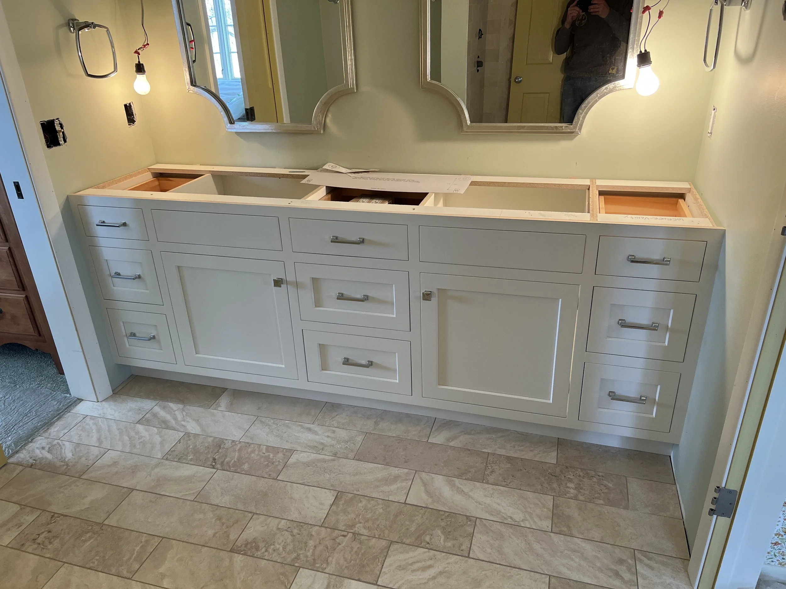 Both of these floating vanities are finished with a soft grey stain on white oak with full overlay doors and drawers